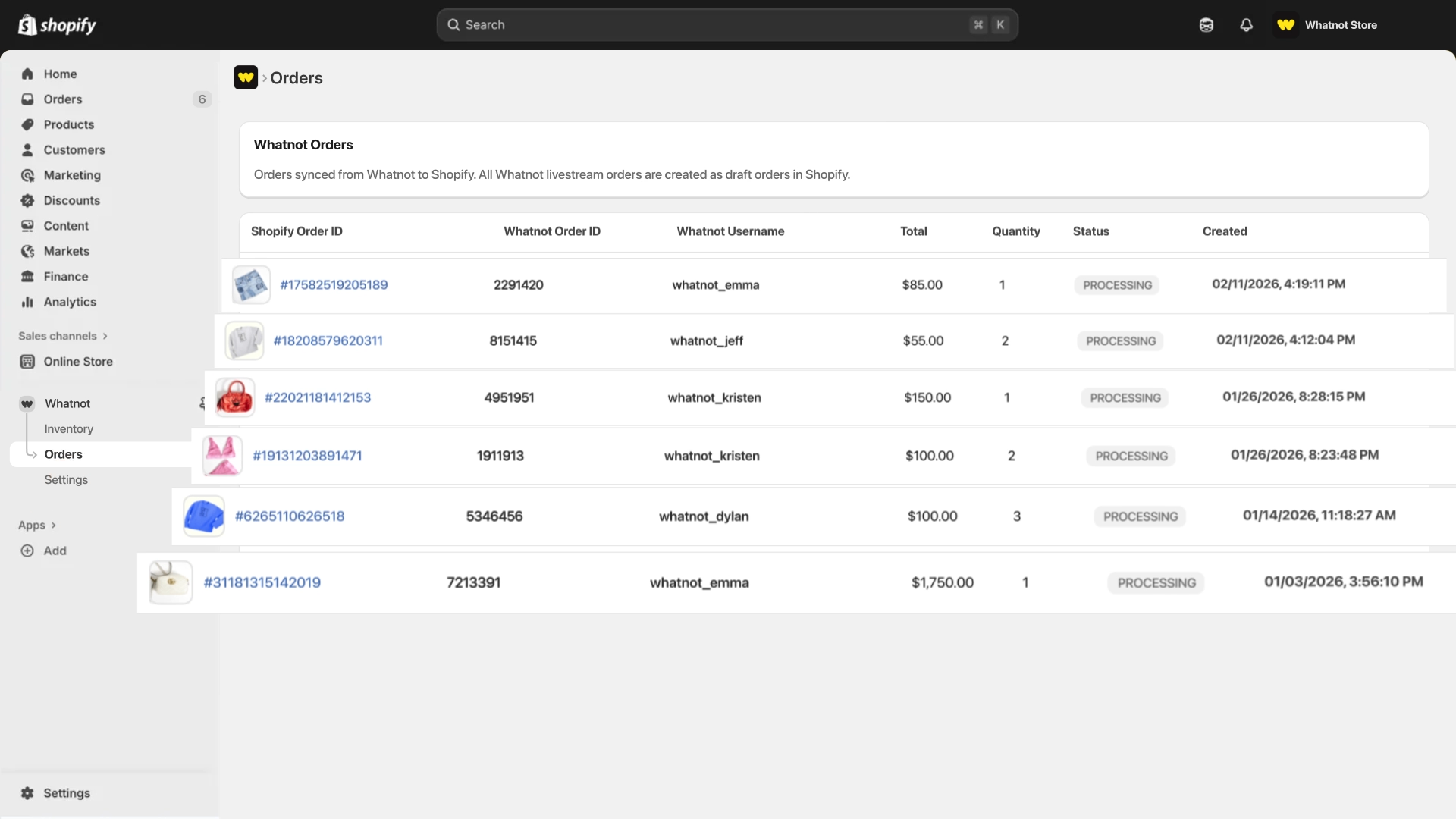 If you’re already selling on Whatnot and using Shopify to manage the rest of your business, you can now connect the two and eliminate manual reconciliation, just like GainesPet, FashioNica, and GlowLuxury. Add products in bulk, keep inventory automatically aligned, and let orders flow directly into your existing fulfillment workflow.