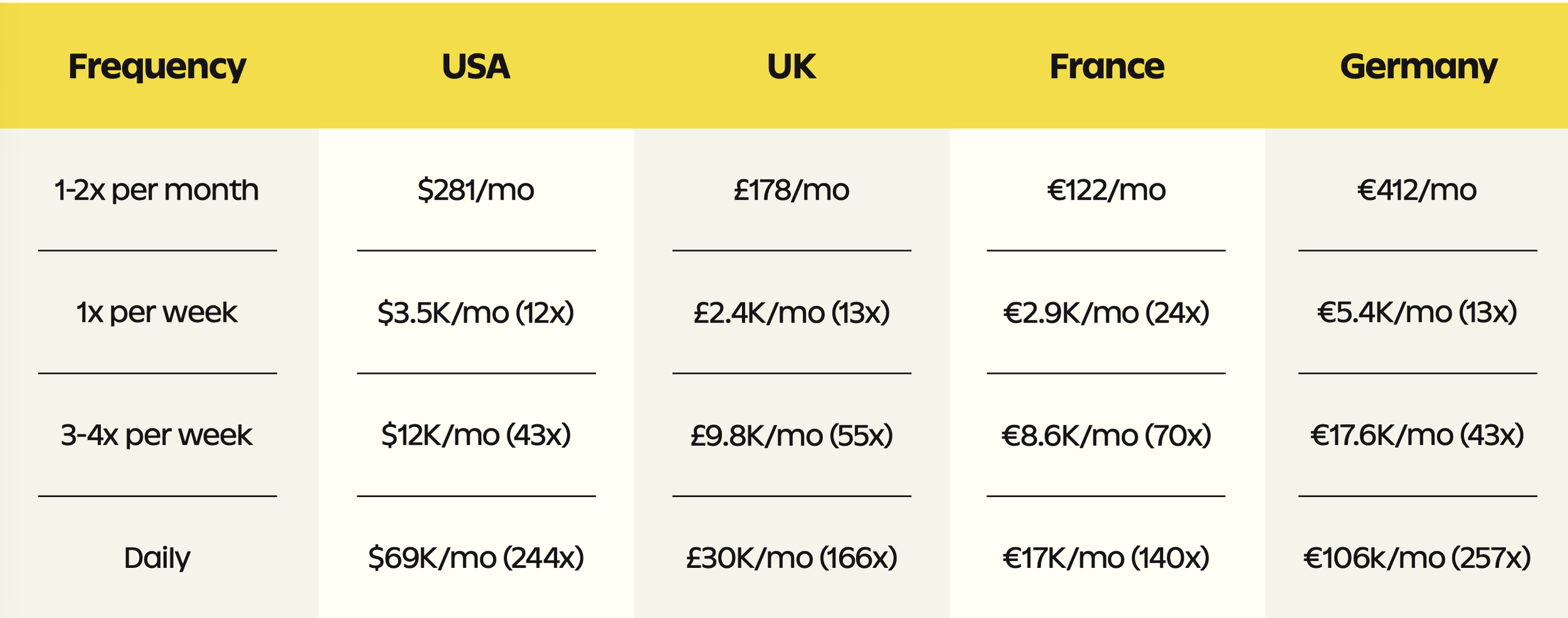 Live selling rewards consistency. Sellers who go live 3-4 times per week earn 40-70x more than those who stream once or twice a month. Daily sellers push that even further, earning 100-250x more. The jump from monthly to weekly alone delivers 10-20x returns, and it compounds from there.